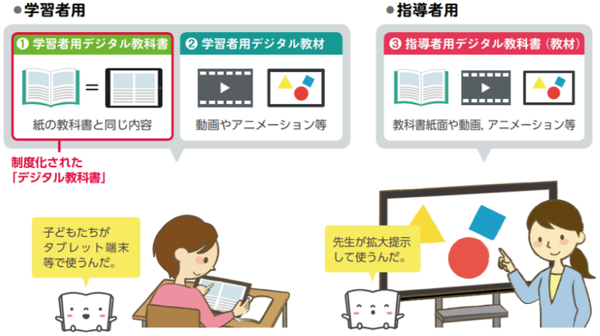 一般的に教育現場では、「学習者用デジタル教科書」だけではなく、「学習者用デジタル教材」との一体的使用や、「指導者用デジタル教科書(教材)」を含む3点がデジタル教科書と位置付けられています。