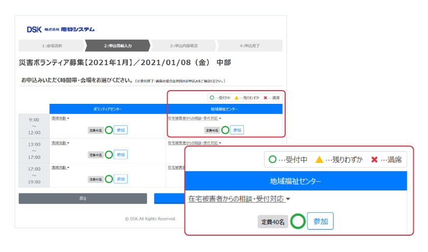 空き枠管理機能:アイコンによる状況表示の他、定員や空き数の表示も可能